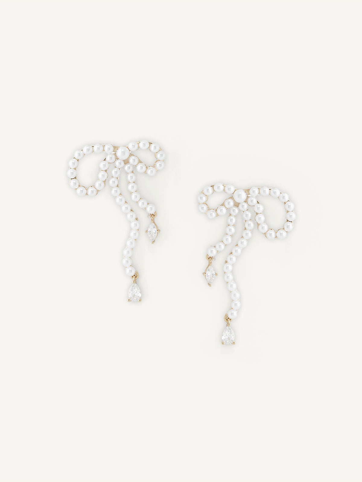 Close-up of a person wearing a delicate pearl bow earrings with a blurred background