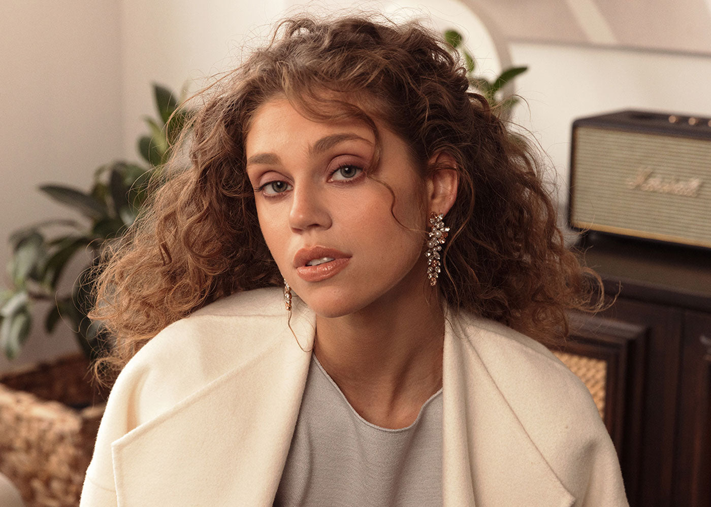 Close-up of a woman wearing a gold necklace and earrings against a neutral background